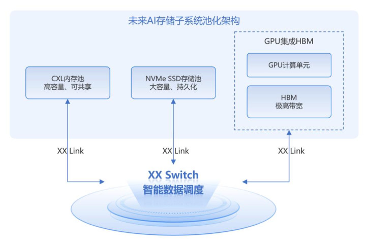可以看到:未来存储子系统将呈现多层化结构,根据介质速率将形成HBM(最快)>池化内存(大容量)> NVMe SSD(持久化存储)的多层结构,由特定的硬件加速器及XXLink协议协同管理数据在层级间的流动,确保数据始终处于最适合的计算单元附近。