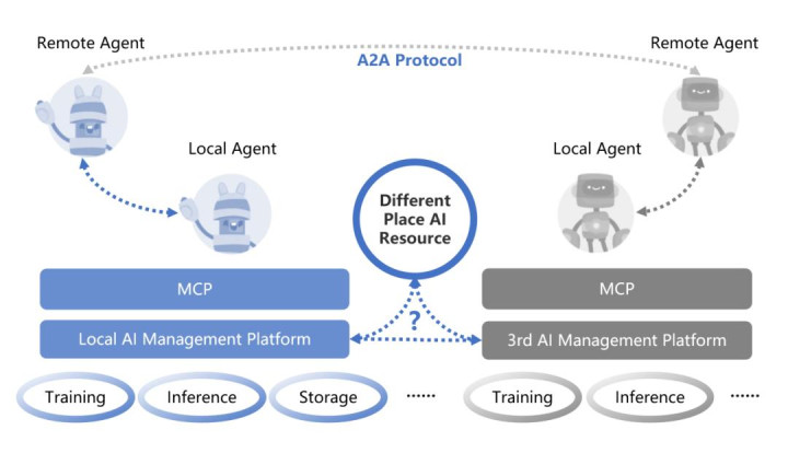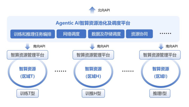 诚然,从网络层面以及训推/推理业务层面进行优化,可以很好的提高Agentic AI场景跨广域训练/推理业务效率,但是无法发挥异属异构的训练推理资源的协同作用,难以将整体资源利用率最大化,极容易造成数据中心各种智算资源的浪费。由此可见,将异属异构的算力及存储等资源统筹,形成统一的数据中心智算资源网络进行灵活编排和调度成为关键,算力资源的池化接入和管理以及智算跨域调度平台显得异常重要。