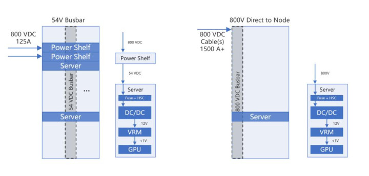 与此同时,随着单个AI机柜功率向兆瓦级迈进,供电架构已成为制约算力密度的关键瓶颈。传统供电体系在空间侵占、铜材消耗和转换效率等方面已触及物理与经济极限。生成式AI的狂飙突进,正倒逼数据中心从“低电压交流多级转换”向“高压直流原生直通”的范式转移。2025 OCP大会上,英伟达提出800VDC架构,通过将配电电压提升至800V高压直流,大幅降低传输电流,从根本上破解高电流带来的空间占用、线缆成本和能量损耗难题,为高密度算力柜释放宝贵空间,并实现端到端能效的量子跃迁。