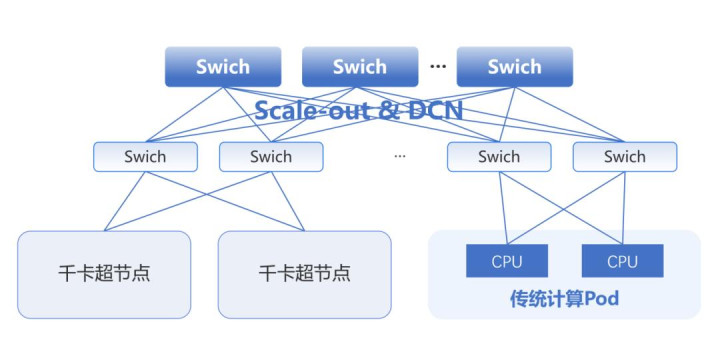 首先,超节点的扩张催生了Scale-out与DCN的融合。传统数据中心长期将Scale-out网络与DCN(数据中心网络)视为独立层级:前者负责万卡级集群的弹性扩展,后者承担传统云计算资源的互联。当超节点规模从百卡级跃升至千卡级时,大部分的流量均可在超节点Scale-up网络域内完成,相应的用于联接超节点之间的Scale-out网络流量会大幅减少。随着DCN网络带宽的稳步增长,以及DCN内应用全域支持RDMA,Scale-out网络和DCN网络融合成为可能。超节点作为DCN接入的一个层级,将成为DCN网络演进的新的变化。