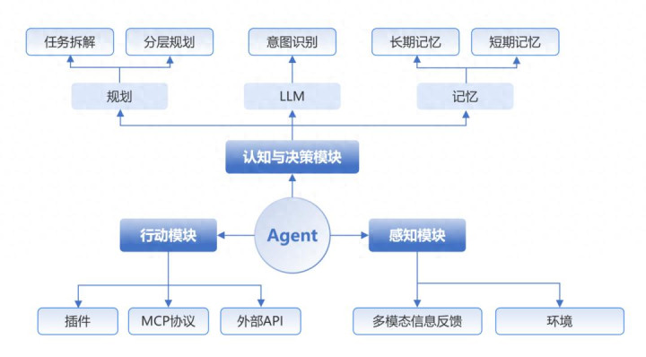 一个典型的AI Agent系统应具备三大模块:感知模块、认知与决策模块、行动模块。