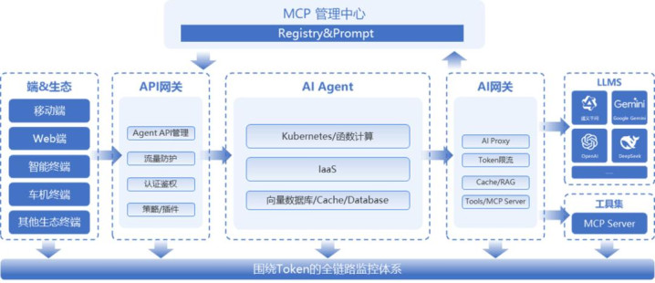 AI Agent需要进行“决策”,即对接LLMs,不同大模型平台的接口协议不同,因此需要中间层进行屏蔽。AI Agent还需要进行“执行”,即对接MCP Servers,这里同样需要一个中间层进行协议转换。我们将这个中间层称为“AI网关”。此外,由于MCP Server众多,还需要有一个MCP管理中心来管理MCP Server的注册与发现。
