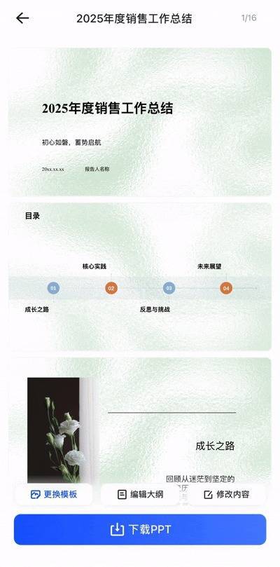 我们将千问刚刚生成的年终总结文档上传后,千问会自动生成大纲、提炼要点并匹配合适的模板,最终输出一份可以直接用于汇报的PPT文件。