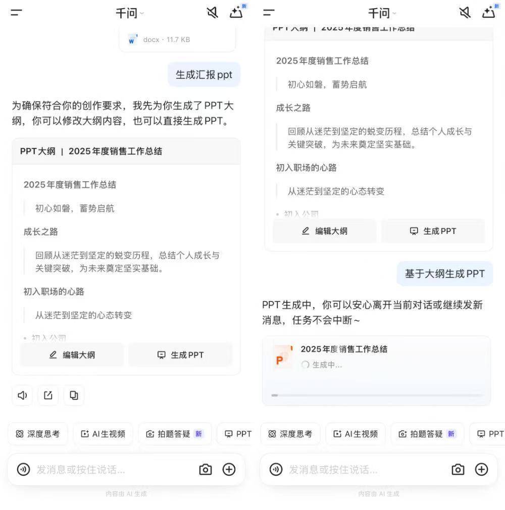 从写一份2000字年终总结,到把纸质材料拍照生成文档,再到一键做出一份可直接用于汇报的PPT,这些流程现在已经能够在千问APP里连续完成。