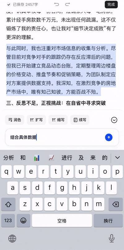 除了从零生成,千问也支持对已有文本进行扩写或调整。我们从文档卡片进入AI写作编辑器,选取其中一段内容,在“AI改写”中输入希望修改的方向后,千问便按要求对该段内容进行了重写。