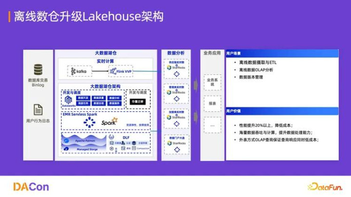 在 2025 年秋季,阿里云 DLF 3.0 成功支撑了阿里巴巴集团闪购业务的准时上线。该业务对数据实时性要求极高,需在秒级内完成用户行为分析、库存预警与营销决策。因为在去年阿里巴巴集团就做了 Alake 项目,基于 Lakehouse 架构构建了整个平台,所以基于 DLF 可以让流批做更好地融合。面向用户场景会有 BI 场景、AI 场景,这套架构可以很好地兼容两种场景的使用,灵活选择多种引擎应对业务方的需求。