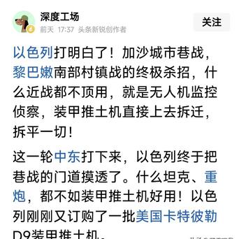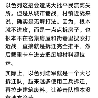 这种“平推”战术,在加沙对付哈马斯时就用过,虽造成平民流离失所,但却极大减少人员伤亡,把哈马斯制服了!